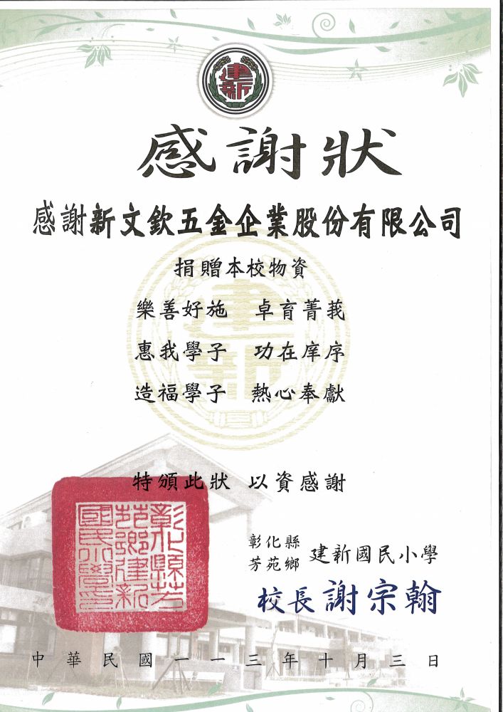 > 社會公益與關懷 > 社會公益-感謝狀-彰化縣芳苑鄉建新國民小學